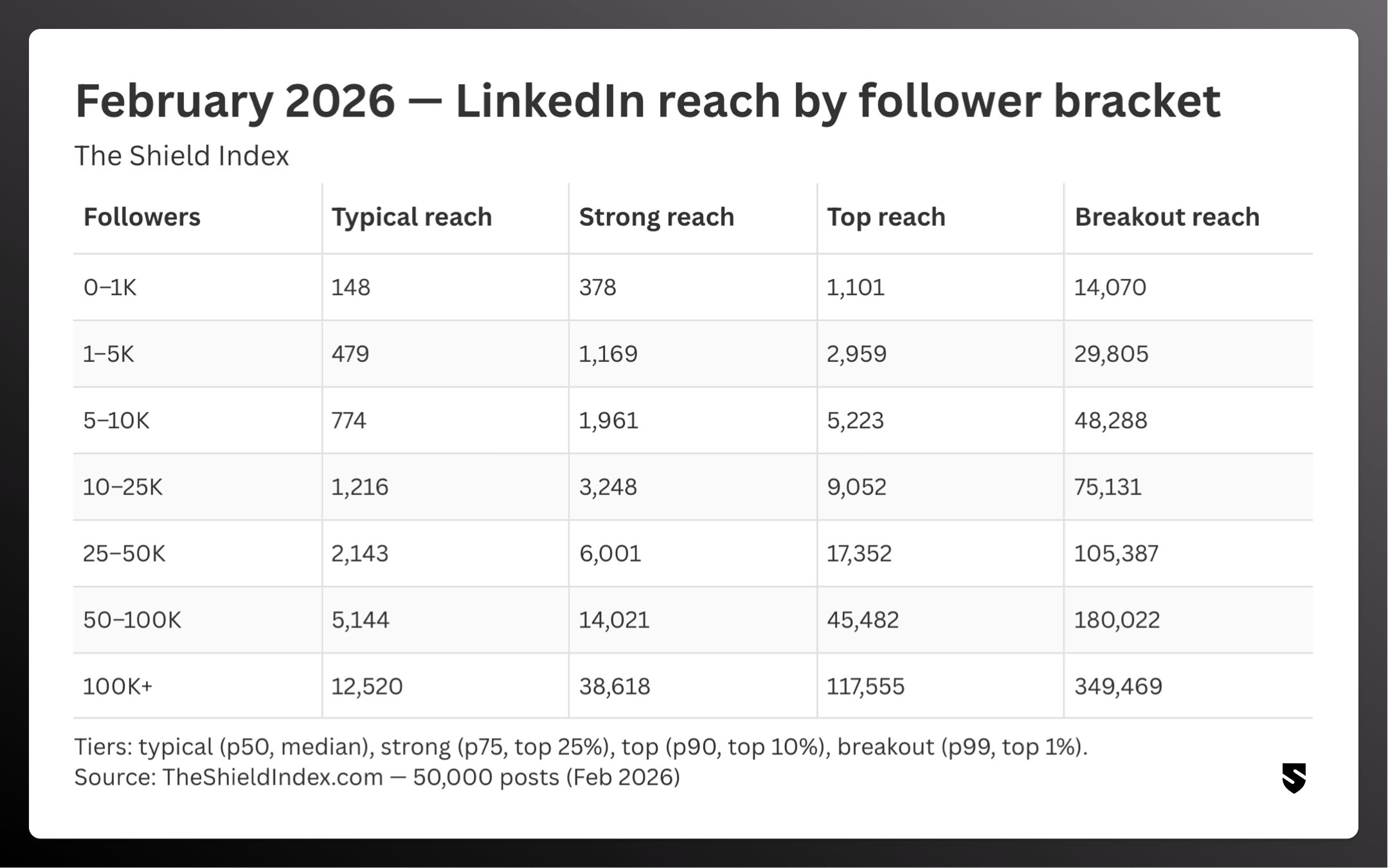 We tracked 50,000 LinkedIn posts in February and measured reach across seven follower brackets at four performance tiers: typical (p50, median), strong (p75, top 25%), top (p90, top 10%), and breakout (p99, top 1%).
